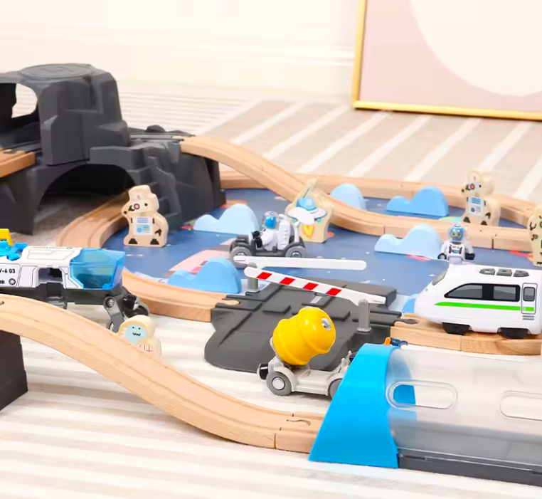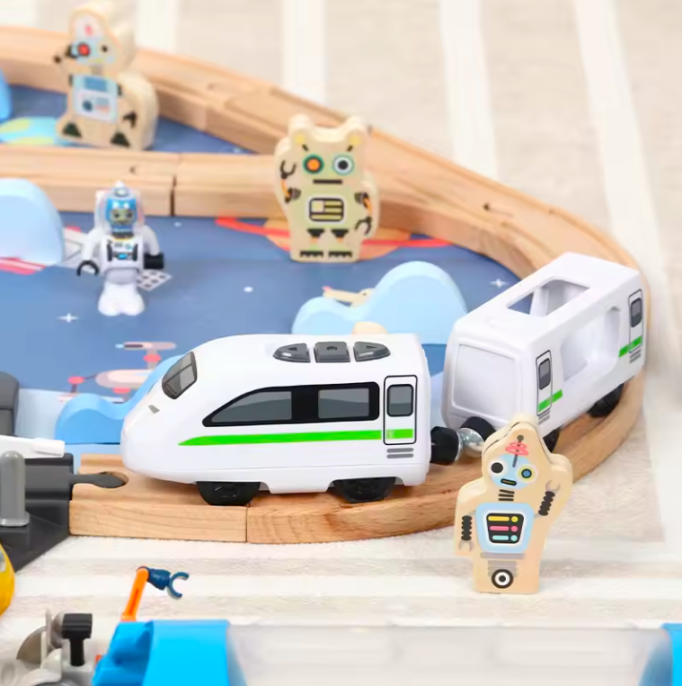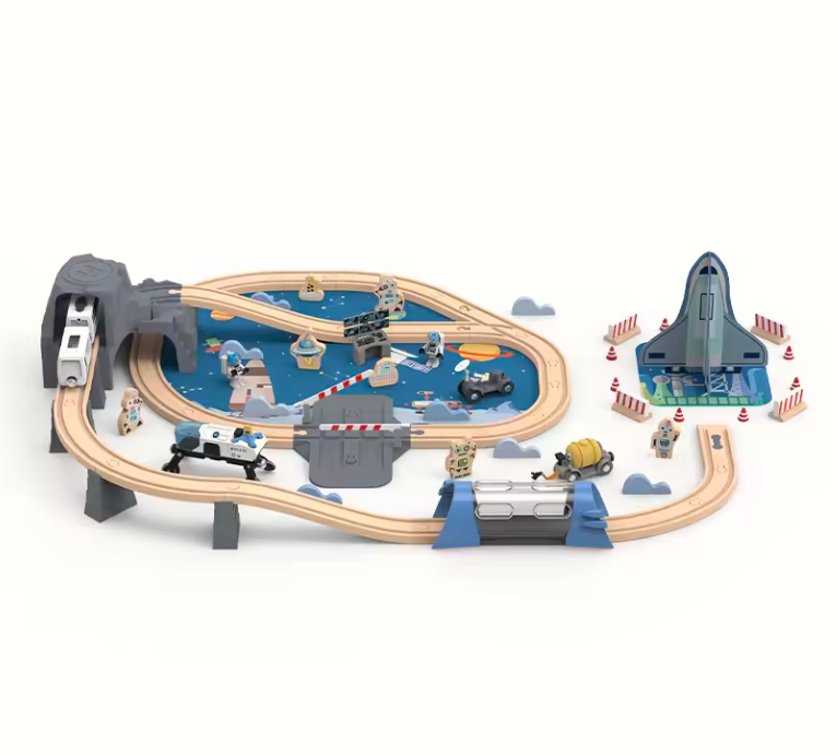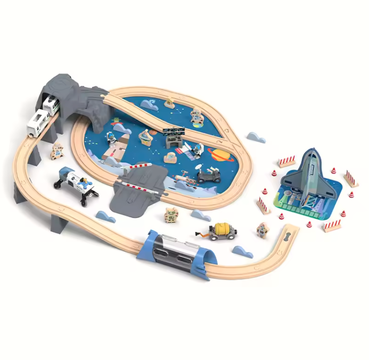Esta pista de comboio elétrico em madeira transforma o quarto das crianças num cenário intergaláctico repleto de exploradores espaciais, astronautas e robôs.