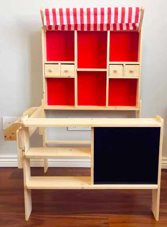 - Prateleiras e Gavetas: para organizar e exibir diferentes produtos, como frutas, legumes, brinquedos de imitação, e muito mais.