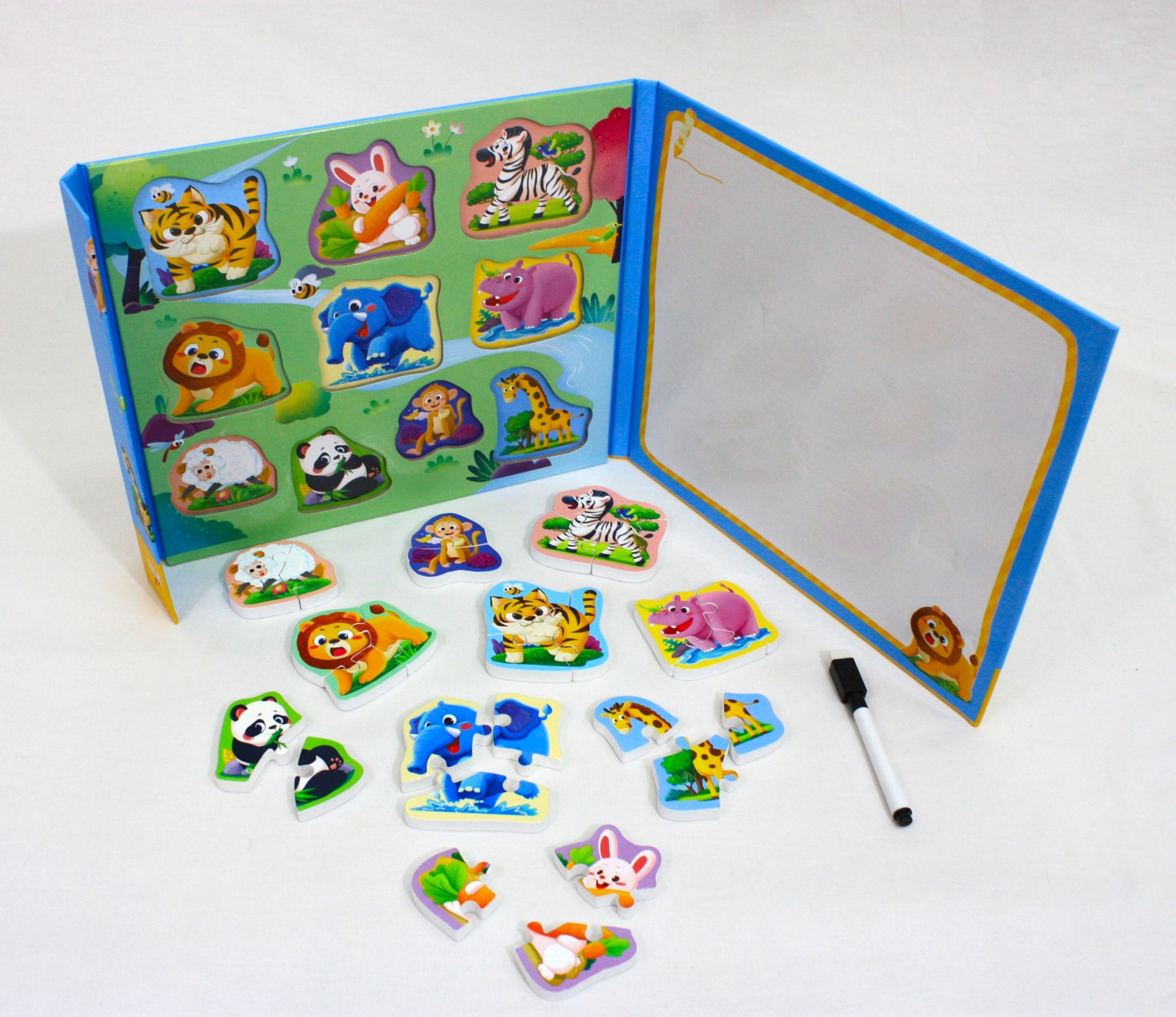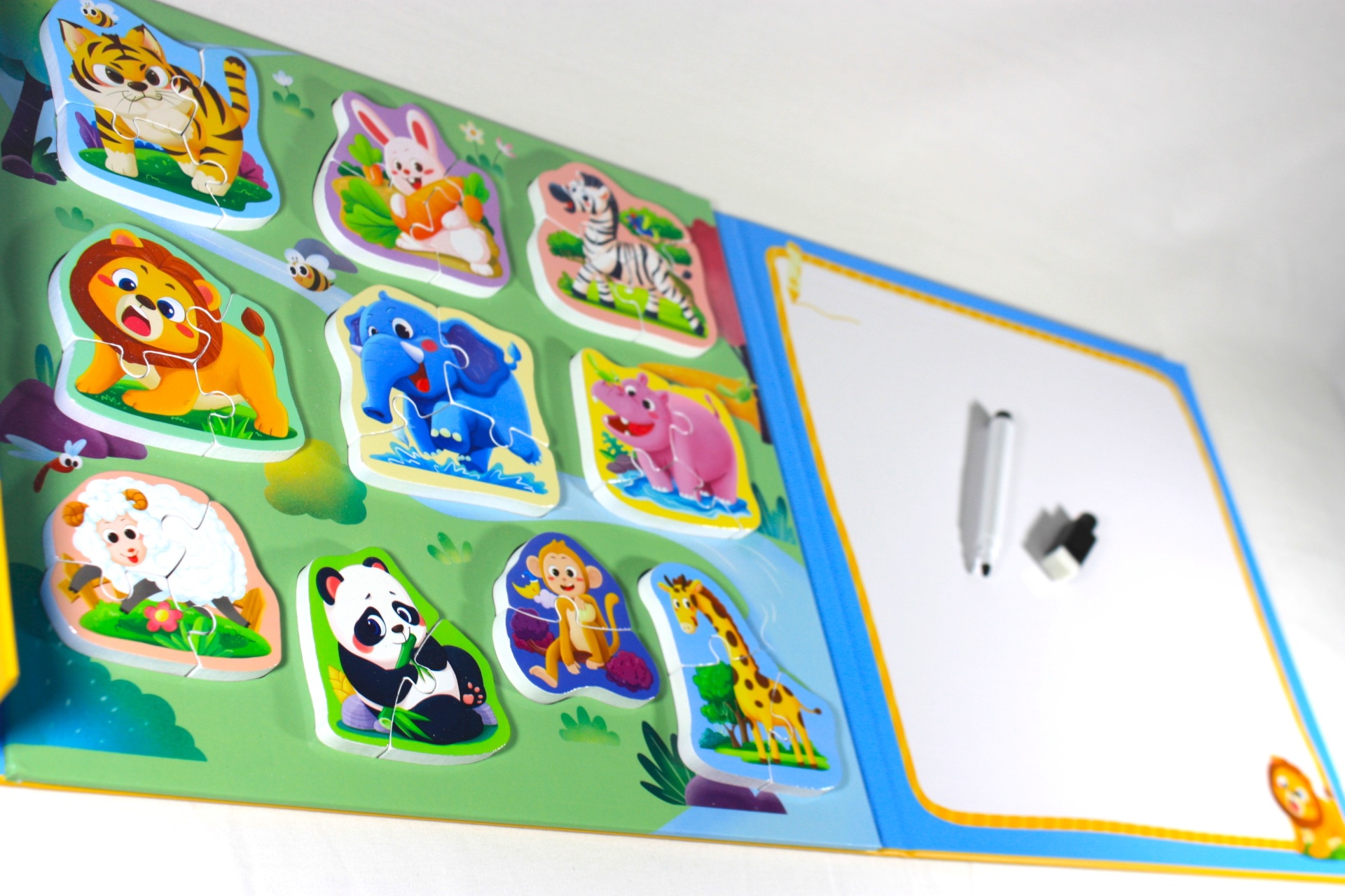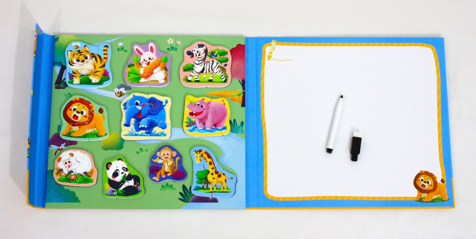 Dedicado aos "Animais Selvagens", este livro é uma aventura emocionante pela vida selvagem. De um lado, as crianças podem montar quebra-cabeças com animais exóticos. E, do outro lado, podem dar vida à selva com suas próprias histórias e desenhos.
