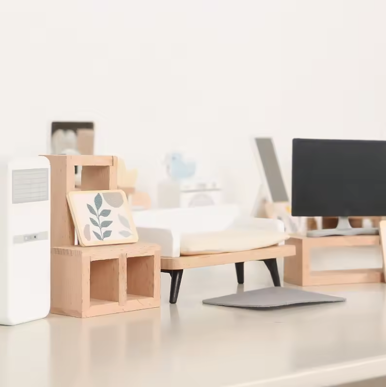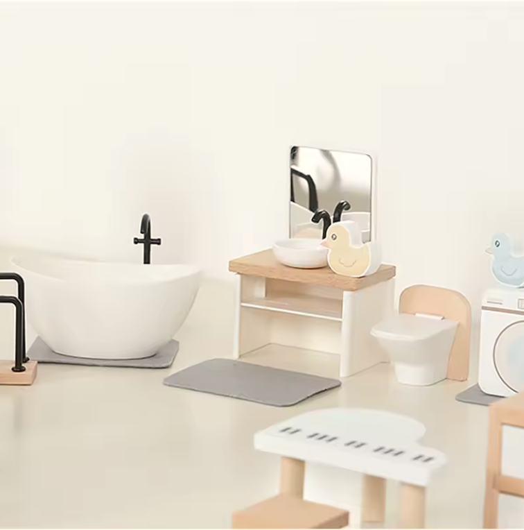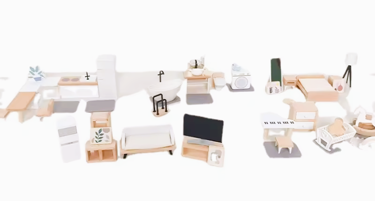 Brincar com conjuntos de mobília miniatura incentiva o jogo de faz de conta, o que ajuda as crianças a praticar interações sociais, comunicação e resolução de conflitos em um ambiente seguro.
