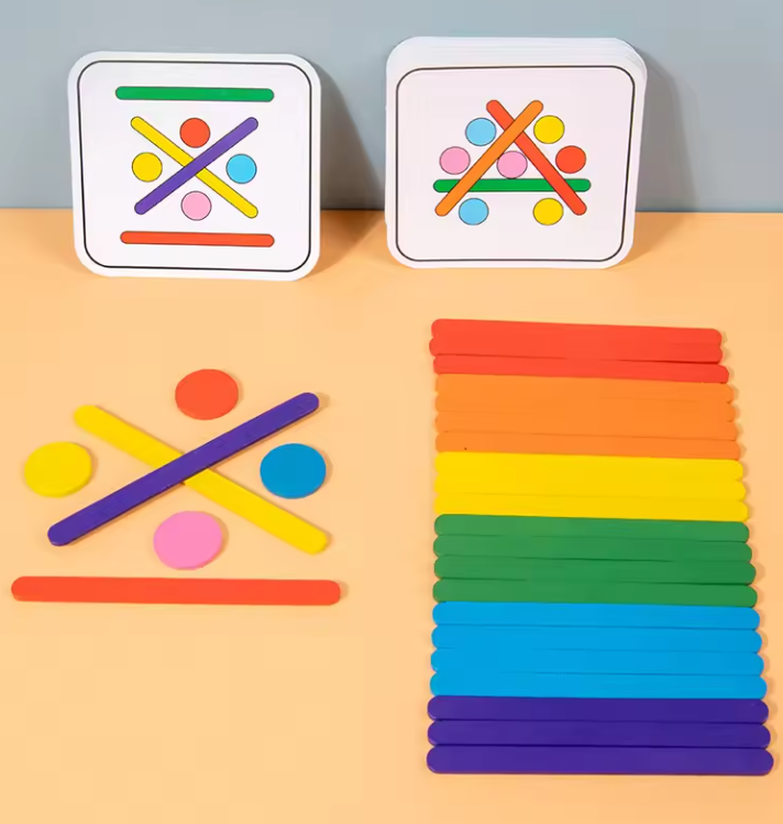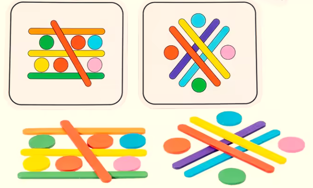 Ao desmontar os padrões em elementos individuais, como círculos e sticks coloridos, as crianças praticam o pensamento analítico. O que mais ainda é estimulado com o objetivo de conjugá-los de forma igual à constante do cartão-desafio.