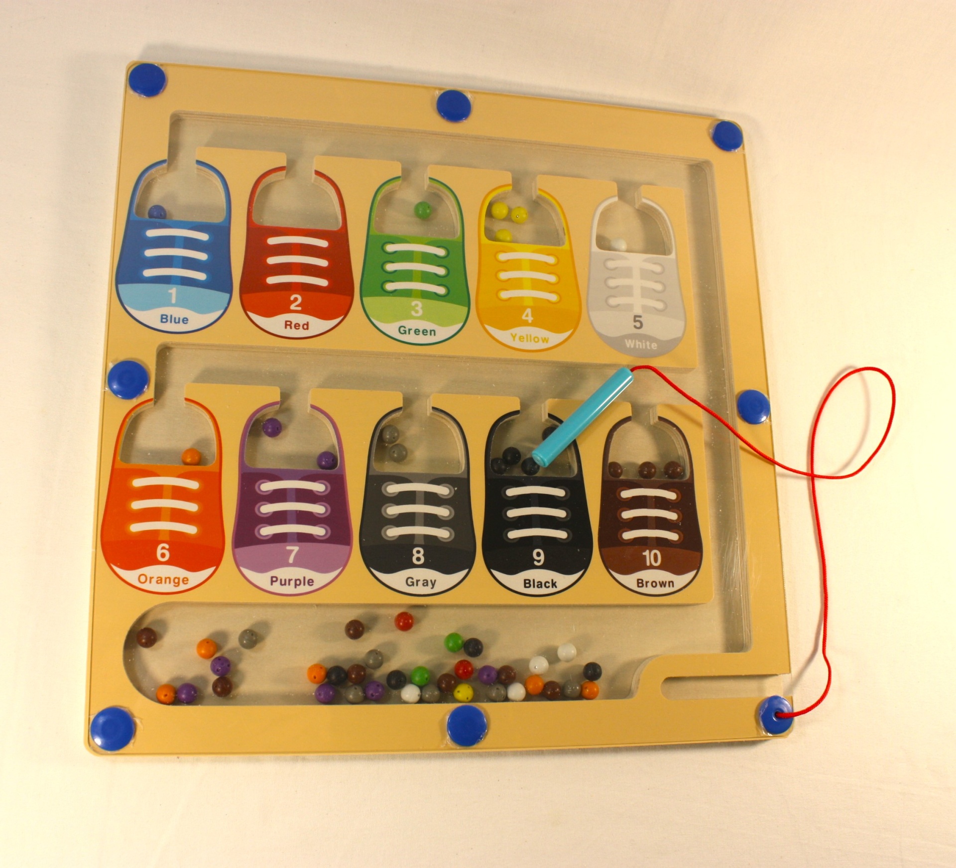 Objetivo: guiar as bolas metálicas pelo labirinto através da caneta até aos sapatos. A dificuldade aumenta na medida em que se tem de respeitar as cores e os números. Ou seja, se o sapato laranja apresenta o número 6, então devem encaminhar-se até esse sapato 6 bolas laranjas.