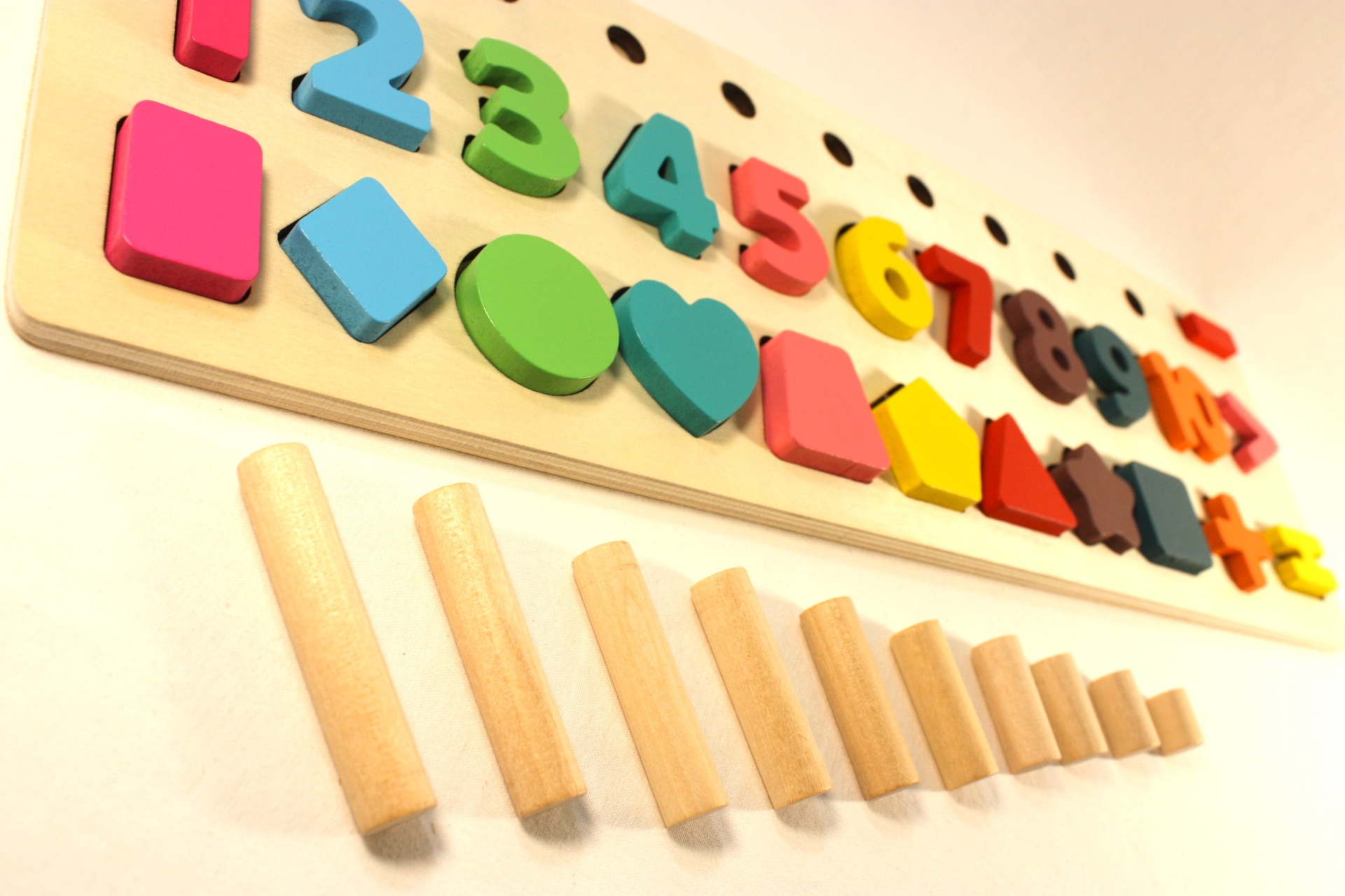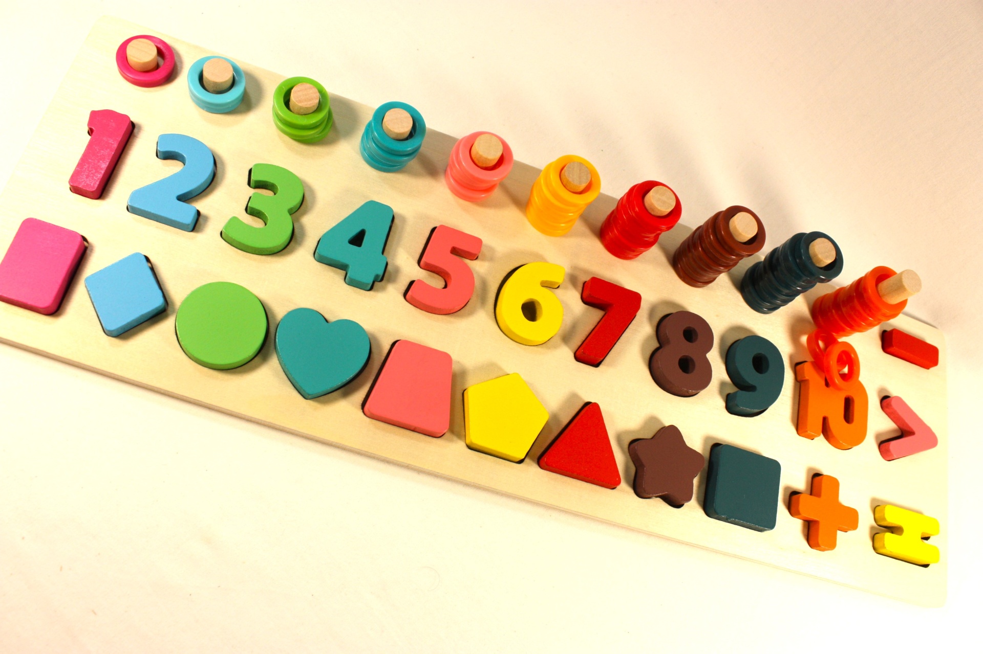 Encaixar os números e formas nas filas e empilhar os aros requer destreza e coordenação motora fina.