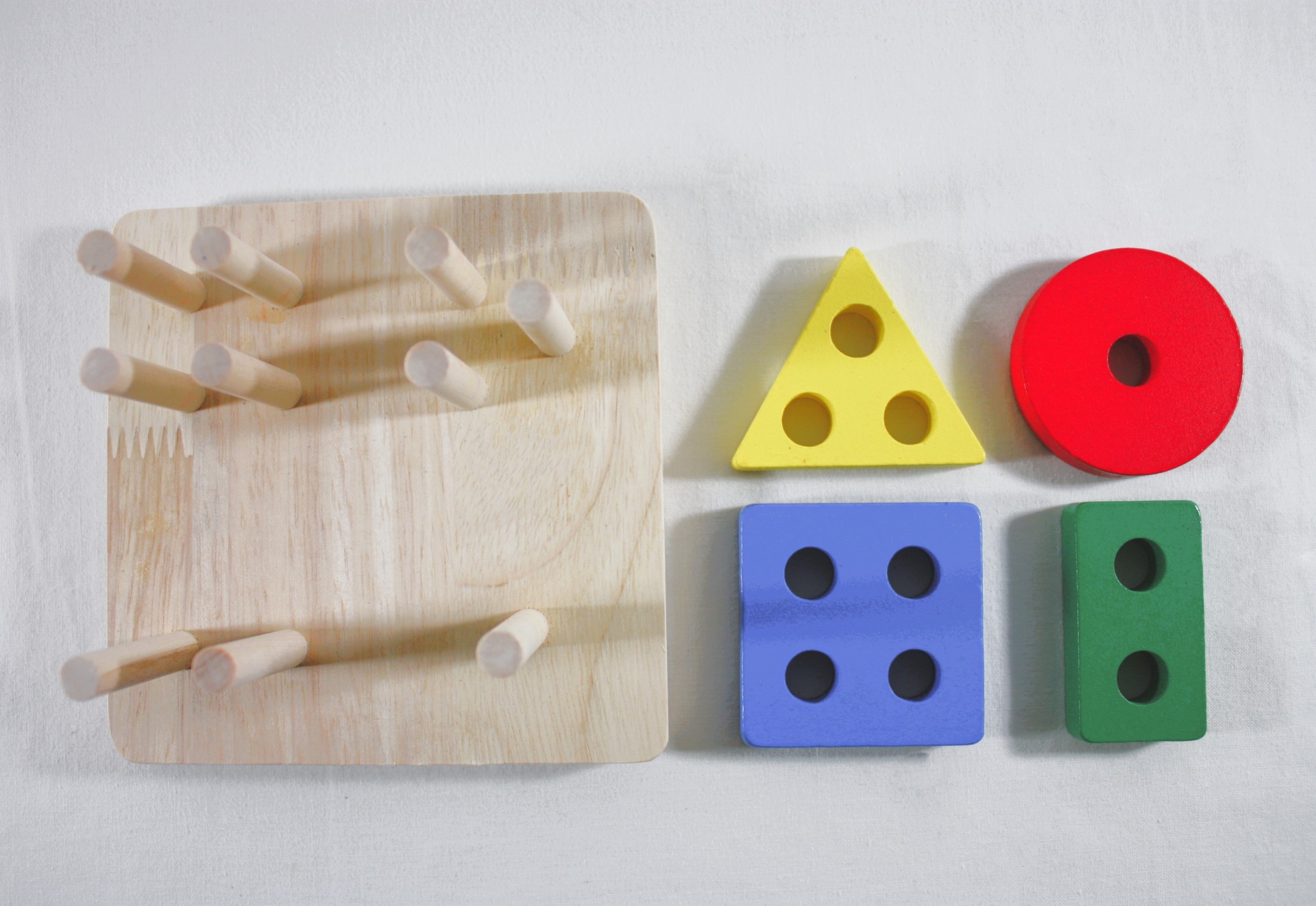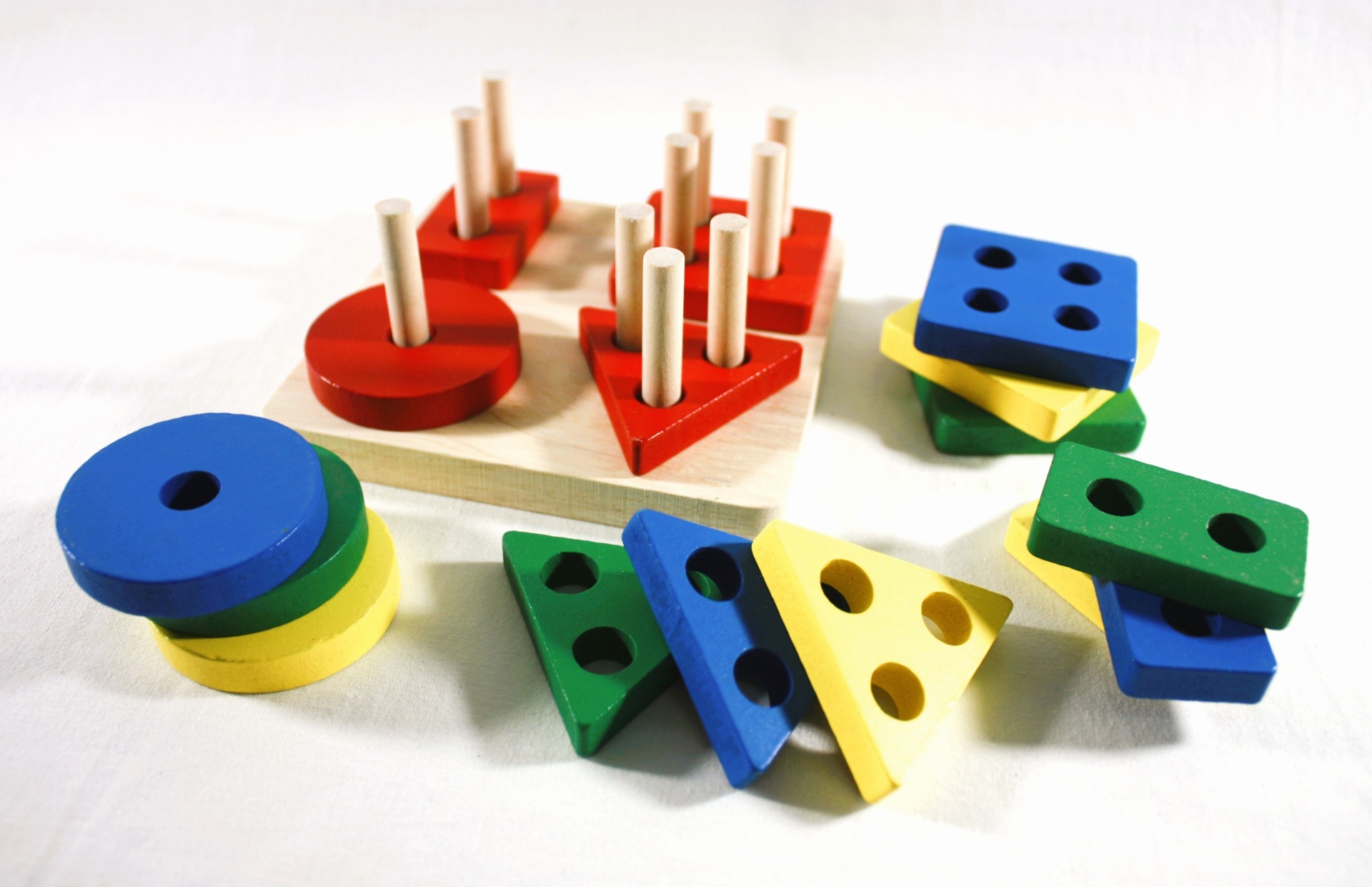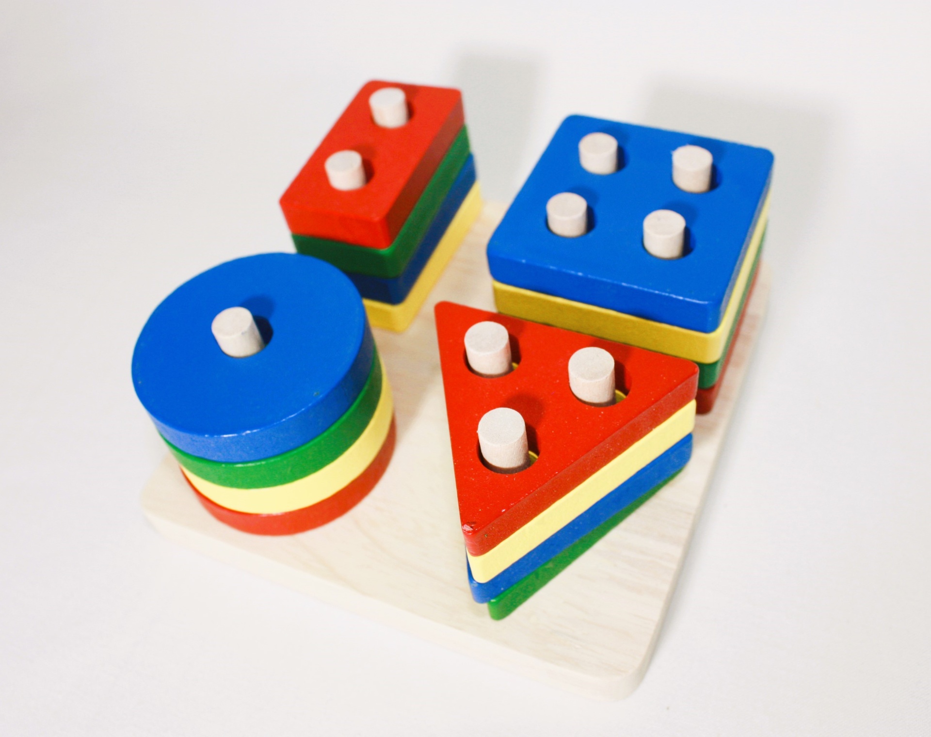 Ao combinar as peças de madeira nas formas correspondentes nos pilares, as crianças aprendem a identificar e a reconhecer diferentes formas geométricas.