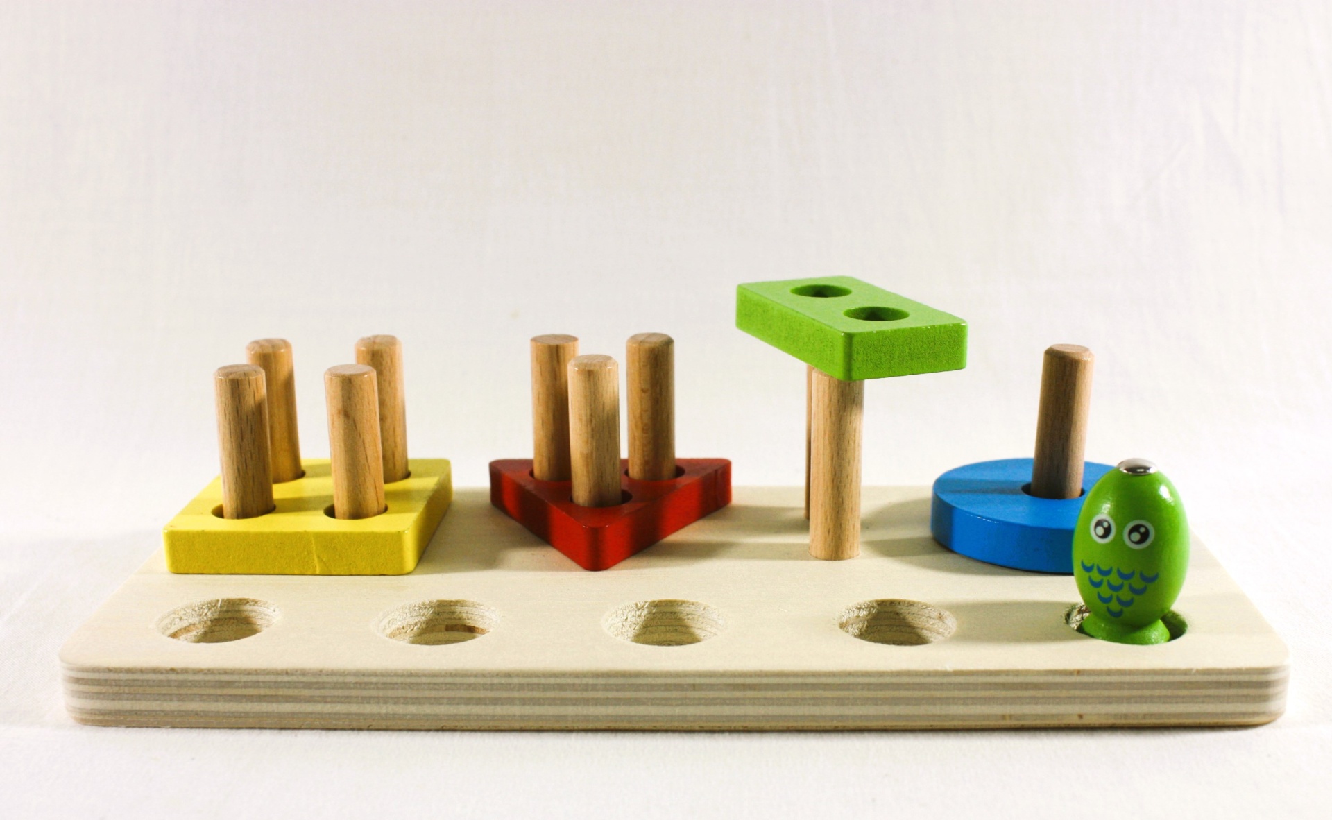 Ao combinar as peças de madeira nas formas correspondentes nos pilares, as crianças aprendem a identificar e a reconhecer diferentes formas geométricas.